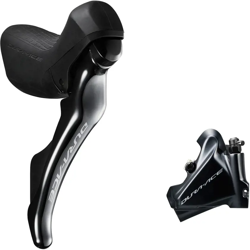 - Precision-engineered high performance Dura Ace hydraulic disc brake sti's give you control, modulation and power with minimal effort in all riding conditionsdura-ace r9100 sti are lightweight thanks to carbon fibre lever blades, carbon composite bracket body, and a titanium clamp band / fixing bolthydraulic brake lever provides excellent stopping power with less effort especially from the hood positionhydraulic reservoir tank provides pad to rotor clearance auto-adjust maintaining braking performance during pad wearshift cables routed under the bar tape using polymer coated inner wires make for a smooth shift action, providing faster, lighter shiftingvivid index shifting with short stroke to the release levers gives a quick and accurate shiftgear shift cables can either be routed round the front or rear of the handlebar to suit all rider preferencesergonomic shift arc follows natural hand movement with inward shift stroke distance reduced for rapid and precise gear changessmall volume ergonomically designed smooth lever hoods for added comfortfinely tuneable reach adjusters for the levers enable custom fitment for all handsfree stroke adjustment for pad to rotor contact settingkit contains left hand bled st-r9120 sti, br-r9170 flat mount brake calliper with pads, hoses and mineral oil (without rotors or adapters)weight: 505 grams per set